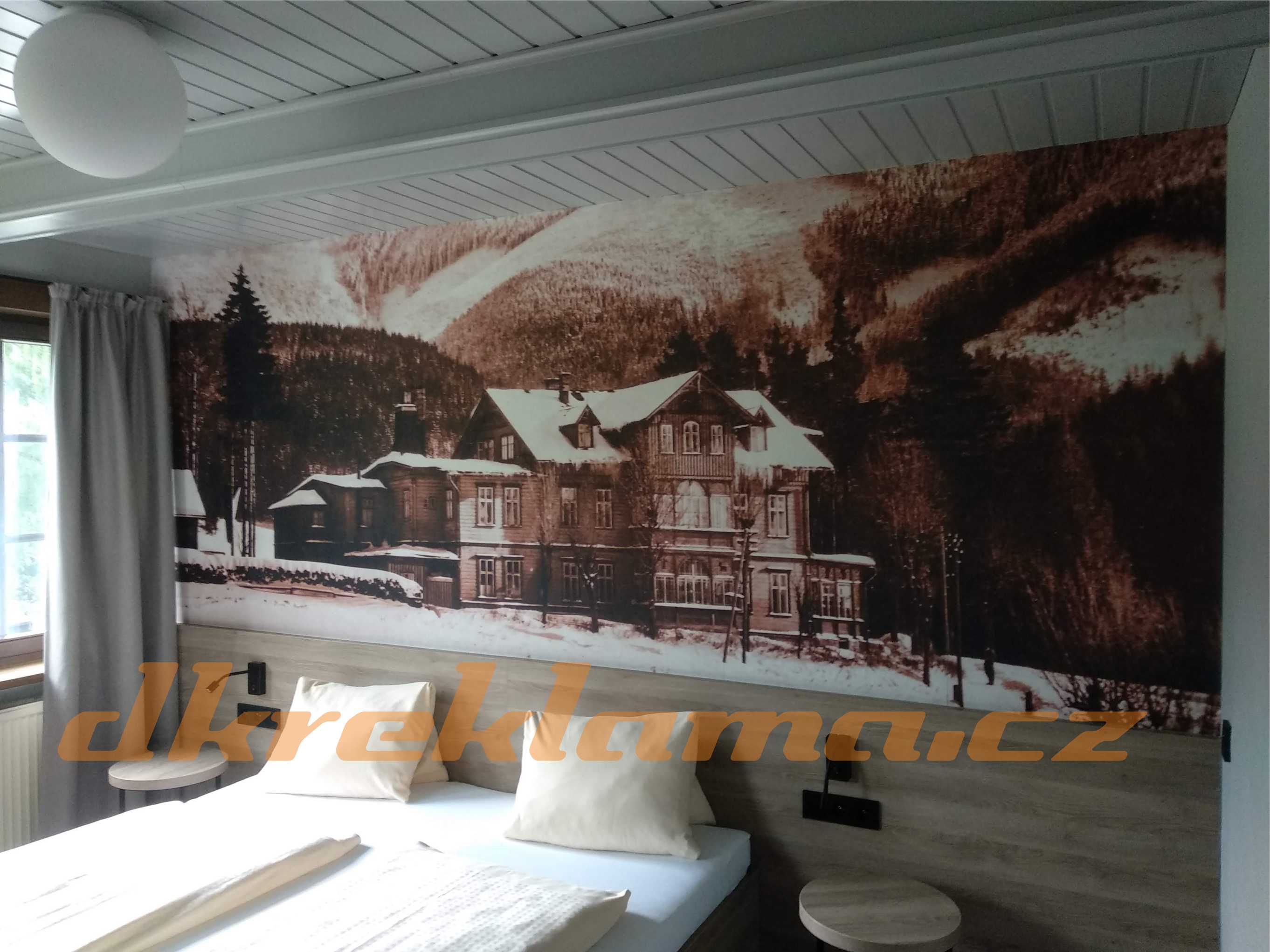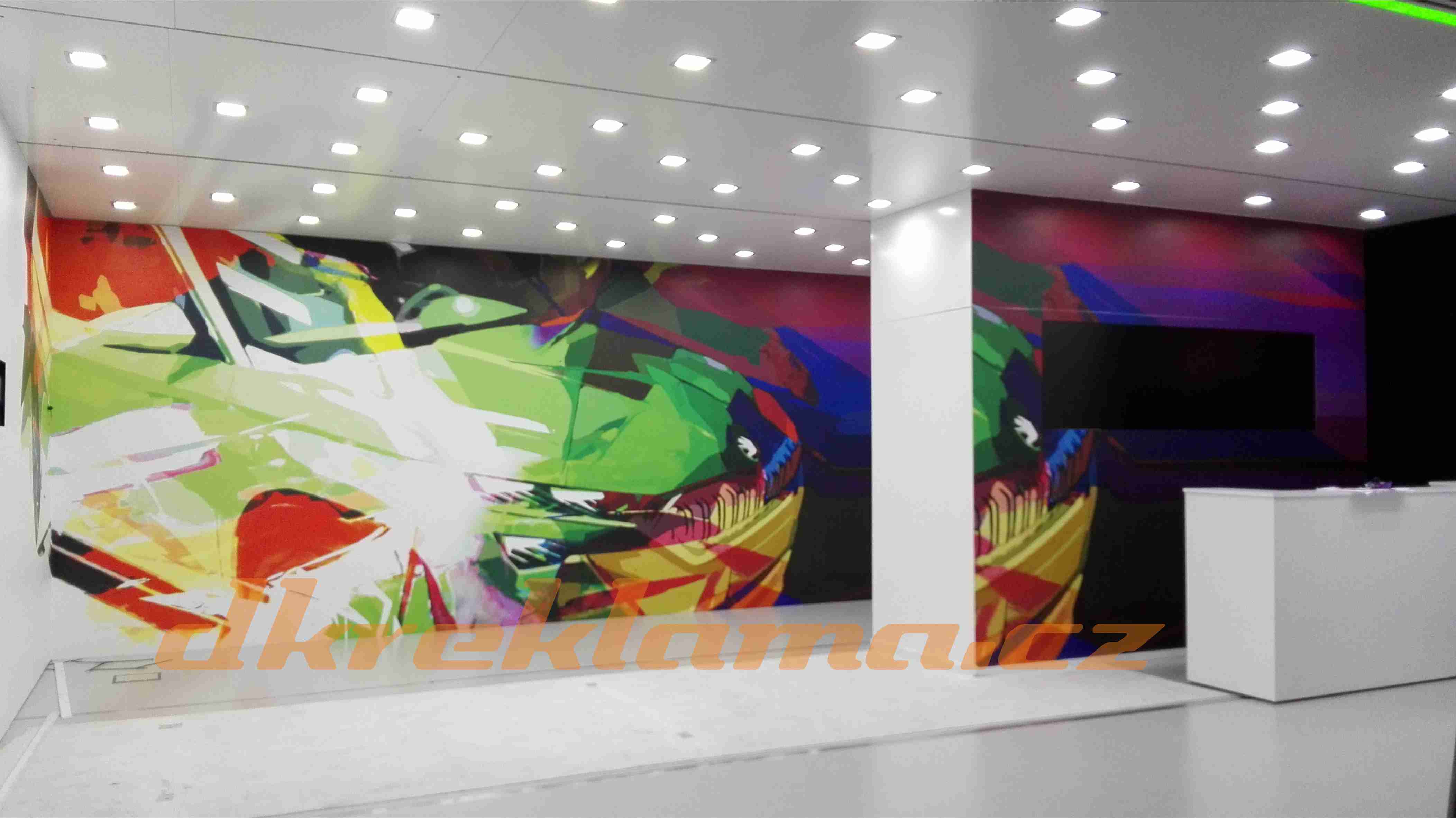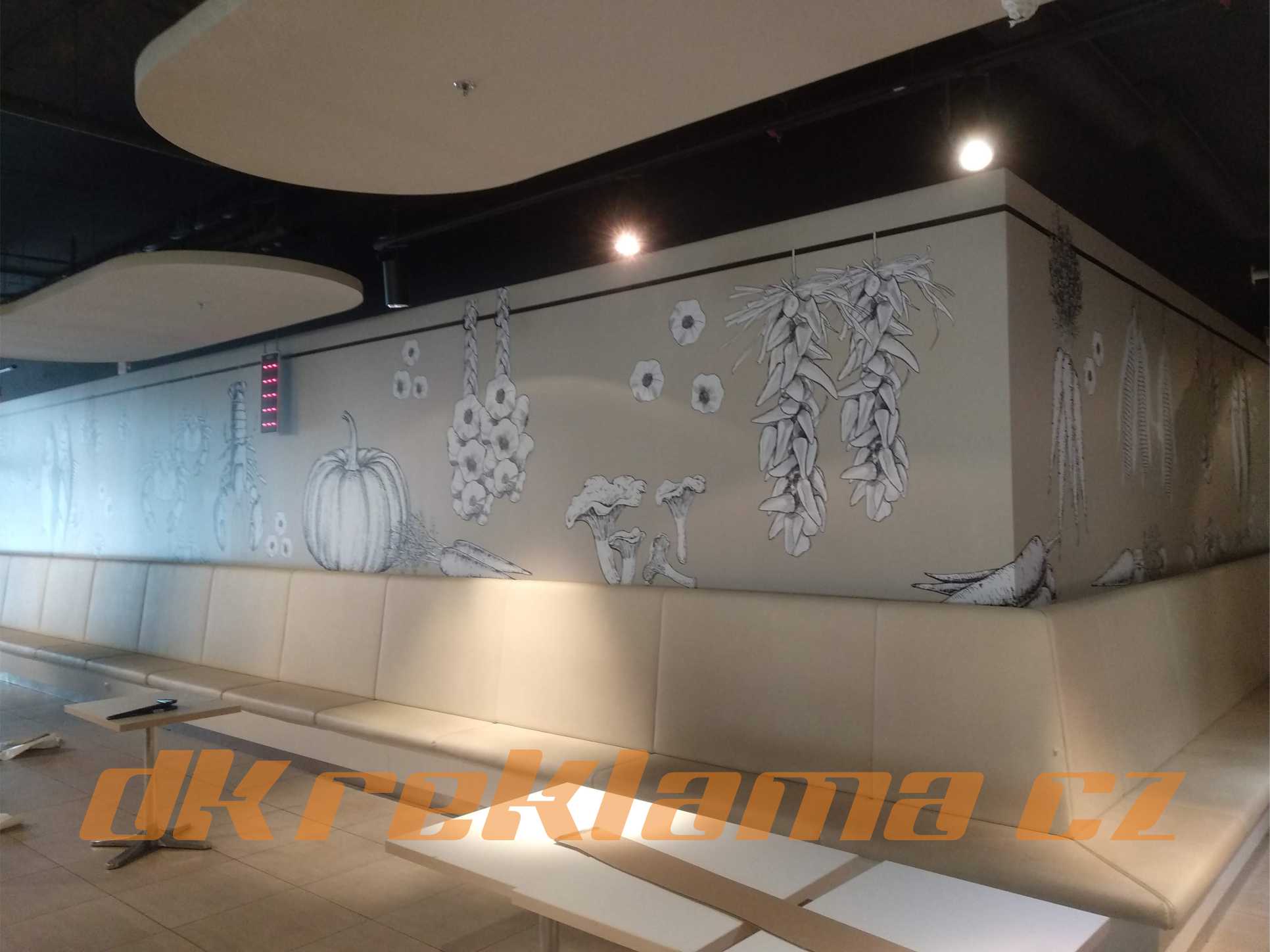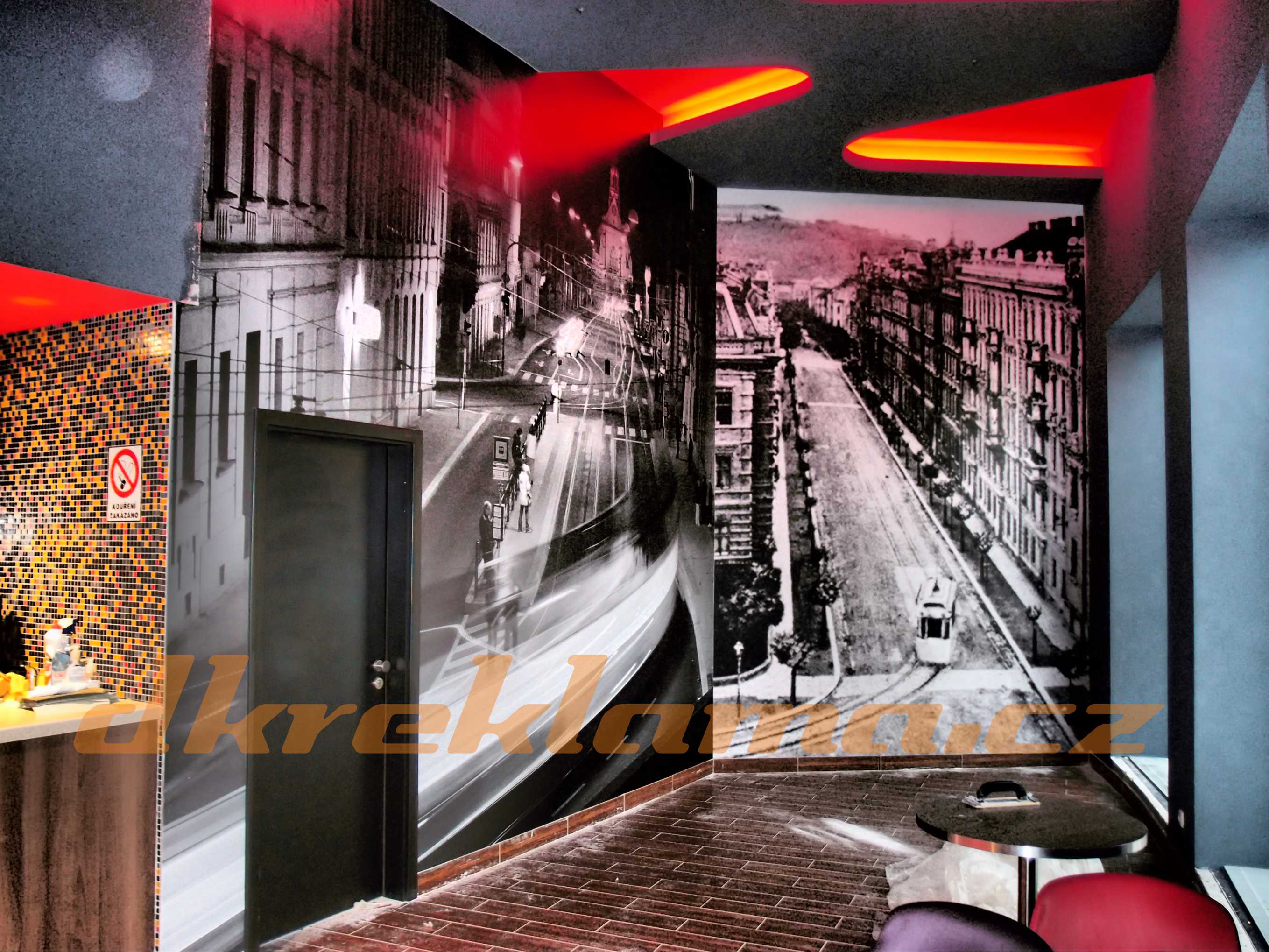 Používáme speciální interiérové  Wall Wrap  fólie,  pískované sklo atd.